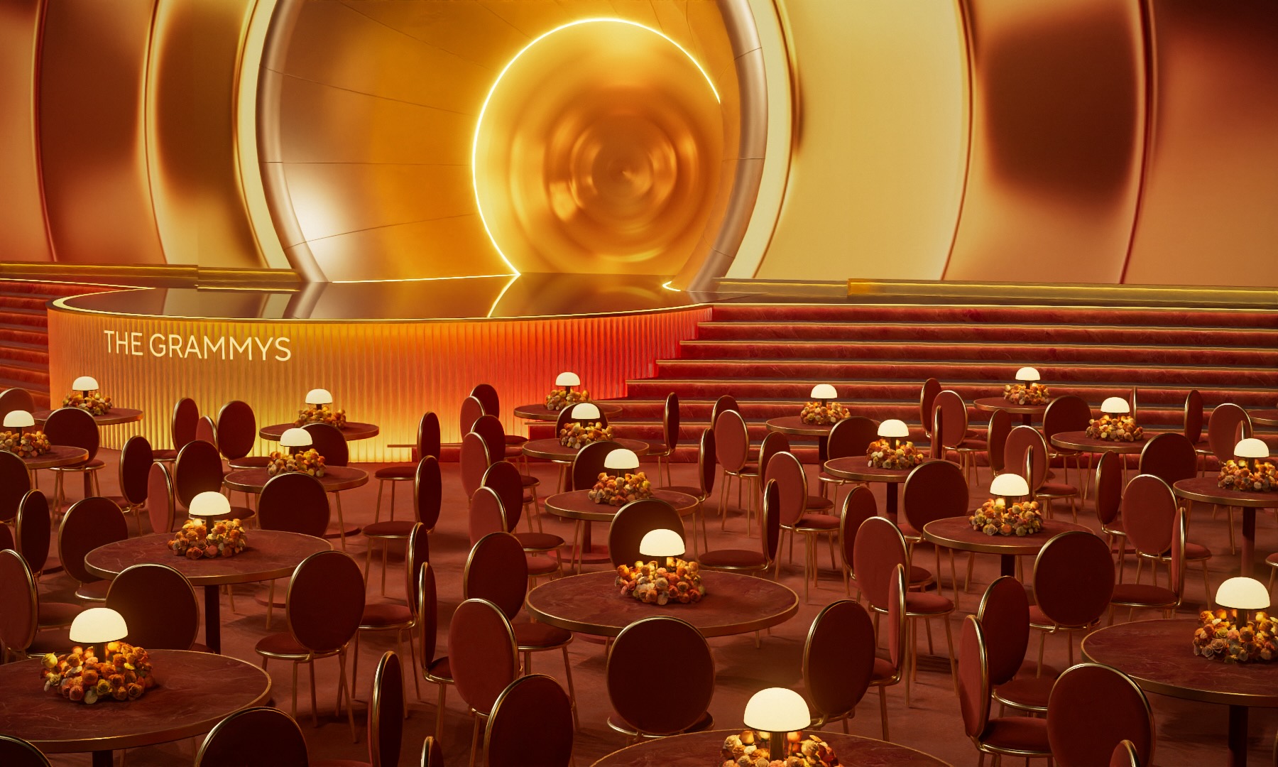 A layered terracotta palette—spanning soft clay, blush, rust, and burnt sienna—anchored the design. Custom carpet and seating immersed the arena in warmth, while subtle gold accents nodded to the Grammy’s heritage and connected back to the gramophone.